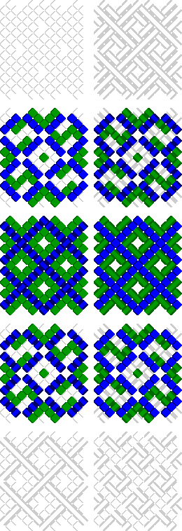 Some of the images here, however, show both faces. In these cases, care has been taken to integrate the colors and textures so that either side can be the front. The many variations on "Lace", shown here in single-color and multi-color (to emphasize the various patterns), serve as excellent examples of texture patterns, color patterns, and combinations:
