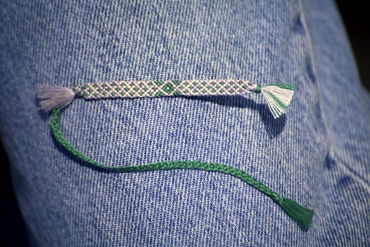 "Confection" ($20) Single-tailed bookmark in silk embroidery floss ("Interlace" pattern)